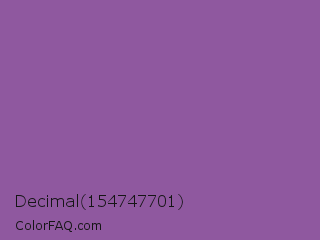 Decimal 154747701 Color is a normal purple color and the nearest color is Trendy Pink #8c6495. Hex code #8f589f and RGB value is rgb(143,88,159). In RGB color space, this color is composed of 56% red, 35% green, 62% blue, In CMYK color space, this color is composed of 10% cyan, 45% magenta, 0% yellow , 38% black , In HSL color space, this color has a hue angle of 286° , 29% saturation and 48% lightness.