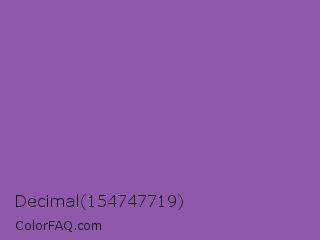Decimal 154747719 Color is a normal purple color and the nearest color is Purpureus #9a4eae. Hex code #8f58ab and RGB value is rgb(143,88,171). In RGB color space, this color is composed of 56% red, 35% green, 67% blue, In CMYK color space, this color is composed of 16% cyan, 49% magenta, 0% yellow , 33% black , In HSL color space, this color has a hue angle of 280° , 33% saturation and 51% lightness.