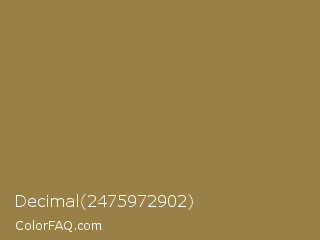 Decimal 2475972902 Color is a normal orange color and the nearest color is Dark Tan #918151. Hex code #998046 and RGB value is rgb(153,128,70). In RGB color space, this color is composed of 60% red, 50% green, 27% blue, In CMYK color space, this color is composed of 0% cyan, 16% magenta, 54% yellow , 40% black , In HSL color space, this color has a hue angle of 42° , 37% saturation and 44% lightness.