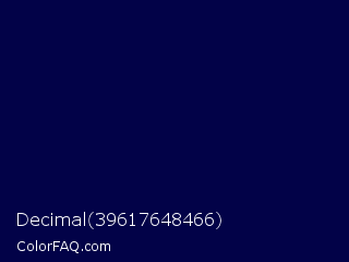 Decimal 39617648466 Color is a very dark blue color and the nearest color is Stratos #000741. Hex code #020248 and RGB value is rgb(2,2,72). In RGB color space, this color is composed of 1% red, 1% green, 28% blue, In CMYK color space, this color is composed of 97% cyan, 97% magenta, 0% yellow , 72% black , In HSL color space, this color has a hue angle of 240° , 95% saturation and 15% lightness.
