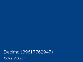 Decimal 39617762947 Color is a dark blue color and the nearest color is Dark Cerulean #08457e. Hex code #024083 and RGB value is rgb(2,64,131). In RGB color space, this color is composed of 1% red, 25% green, 51% blue, In CMYK color space, this color is composed of 98% cyan, 51% magenta, 0% yellow , 49% black , In HSL color space, this color has a hue angle of 211° , 97% saturation and 26% lightness.