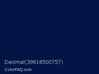 Decimal 39618500757 Color is a very dark blue color and the nearest color is Deep Cove #051040. Hex code #031447 and RGB value is rgb(3,20,71). In RGB color space, this color is composed of 1% red, 8% green, 28% blue, In CMYK color space, this color is composed of 96% cyan, 72% magenta, 0% yellow , 72% black , In HSL color space, this color has a hue angle of 225° , 92% saturation and 15% lightness.