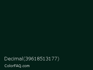Decimal 39618513177 Color is a almost black green color and the nearest color is Holly #011d13. Hex code #032017 and RGB value is rgb(3,32,23). In RGB color space, this color is composed of 1% red, 13% green, 9% blue, In CMYK color space, this color is composed of 91% cyan, 0% magenta, 28% yellow , 87% black , In HSL color space, this color has a hue angle of 161° , 83% saturation and 7% lightness.