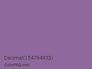 Decimal 154764933 Color is a normal purple color and the nearest color is Trendy Pink #8c6495. Hex code #8f699d and RGB value is rgb(143,105,157). In RGB color space, this color is composed of 56% red, 41% green, 62% blue, In CMYK color space, this color is composed of 9% cyan, 33% magenta, 0% yellow , 38% black , In HSL color space, this color has a hue angle of 284° , 21% saturation and 51% lightness.