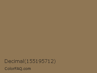 Decimal 155195712 Color is a normal orange color and the nearest color is Pale Brown #987654. Hex code #8f7654 and RGB value is rgb(143,118,84). In RGB color space, this color is composed of 56% red, 46% green, 33% blue, In CMYK color space, this color is composed of 0% cyan, 17% magenta, 41% yellow , 44% black , In HSL color space, this color has a hue angle of 35° , 26% saturation and 45% lightness.