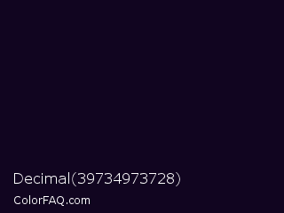 Decimal 39734973728 Color is a almost black violet color and the nearest color is Deep Ebony #0c0b1d. Hex code #110520 and RGB value is rgb(17,5,32). In RGB color space, this color is composed of 7% red, 2% green, 13% blue, In CMYK color space, this color is composed of 47% cyan, 84% magenta, 0% yellow , 87% black , In HSL color space, this color has a hue angle of 267° , 73% saturation and 7% lightness.