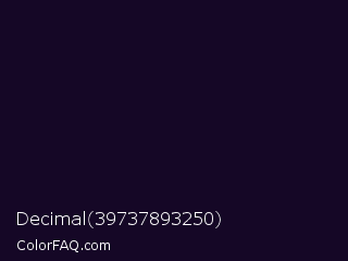 Decimal 39737893250 Color is a almost black violet color and the nearest color is Deep Ebony #0c0b1d. Hex code #150726 and RGB value is rgb(21,7,38). In RGB color space, this color is composed of 8% red, 3% green, 15% blue, In CMYK color space, this color is composed of 45% cyan, 82% magenta, 0% yellow , 85% black , In HSL color space, this color has a hue angle of 267° , 69% saturation and 9% lightness.