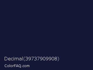 Decimal 39737909908 Color is a very dark blue color and the nearest color is Haiti #1b1035. Hex code #151736 and RGB value is rgb(21,23,54). In RGB color space, this color is composed of 8% red, 9% green, 21% blue, In CMYK color space, this color is composed of 61% cyan, 57% magenta, 0% yellow , 79% black , In HSL color space, this color has a hue angle of 236° , 44% saturation and 15% lightness.