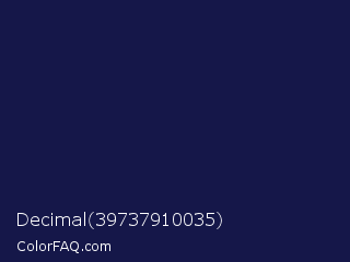 Decimal 39737910035 Color is a very dark blue color and the nearest color is Bunting #151f4c. Hex code #151749 and RGB value is rgb(21,23,73). In RGB color space, this color is composed of 8% red, 9% green, 29% blue, In CMYK color space, this color is composed of 71% cyan, 68% magenta, 0% yellow , 71% black , In HSL color space, this color has a hue angle of 238° , 55% saturation and 18% lightness.