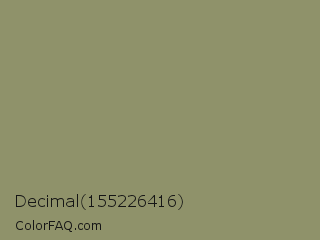 Decimal 155226416 Color is a normal yellow color and the nearest color is Avocado Pulp #888d65. Hex code #8f926a and RGB value is rgb(143,146,106). In RGB color space, this color is composed of 56% red, 57% green, 42% blue, In CMYK color space, this color is composed of 2% cyan, 0% magenta, 27% yellow , 43% black , In HSL color space, this color has a hue angle of 65° , 16% saturation and 49% lightness.