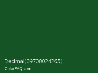 Decimal 39738024265 Color is a very dark green color and the nearest color is Cal Poly Pomona Green #1e4d2b. Hex code #155525 and RGB value is rgb(21,85,37). In RGB color space, this color is composed of 8% red, 33% green, 15% blue, In CMYK color space, this color is composed of 75% cyan, 0% magenta, 56% yellow , 67% black , In HSL color space, this color has a hue angle of 135° , 60% saturation and 21% lightness.