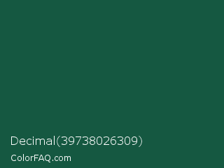Decimal 39738026309 Color is a very dark green color and the nearest color is Green Pea #1d6142. Hex code #155841 and RGB value is rgb(21,88,65). In RGB color space, this color is composed of 8% red, 35% green, 25% blue, In CMYK color space, this color is composed of 76% cyan, 0% magenta, 26% yellow , 65% black , In HSL color space, this color has a hue angle of 159° , 61% saturation and 21% lightness.