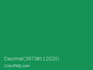 Decimal 39738112020 Color is a normal green color and the nearest color is Eucalyptus #278a5b. Hex code #159256 and RGB value is rgb(21,146,86). In RGB color space, this color is composed of 8% red, 57% green, 34% blue, In CMYK color space, this color is composed of 86% cyan, 0% magenta, 41% yellow , 43% black , In HSL color space, this color has a hue angle of 151° , 75% saturation and 33% lightness.
