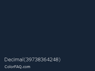 Decimal 39738364248 Color is a very dark blue color and the nearest color is Firefly #0e2a30. Hex code #162436 and RGB value is rgb(22,36,54). In RGB color space, this color is composed of 9% red, 14% green, 21% blue, In CMYK color space, this color is composed of 59% cyan, 33% magenta, 0% yellow , 79% black , In HSL color space, this color has a hue angle of 214° , 42% saturation and 15% lightness.