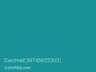 Decimal 39745655303 Color is a normal cyan color and the nearest color is Blue Chill #0c8990. Hex code #179397 and RGB value is rgb(23,147,151). In RGB color space, this color is composed of 9% red, 58% green, 59% blue, In CMYK color space, this color is composed of 85% cyan, 3% magenta, 0% yellow , 41% black , In HSL color space, this color has a hue angle of 182° , 74% saturation and 34% lightness.