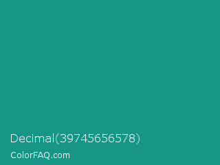 Decimal 39745656578 Color is a normal cyan color and the nearest color is Gossamer #069b81. Hex code #179586 and RGB value is rgb(23,149,134). In RGB color space, this color is composed of 9% red, 58% green, 53% blue, In CMYK color space, this color is composed of 85% cyan, 0% magenta, 10% yellow , 42% black , In HSL color space, this color has a hue angle of 173° , 73% saturation and 34% lightness.
