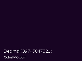 Decimal 39745847321 Color is a almost black purple color and the nearest color is Deep Ebony #0c0b1d. Hex code #180423 and RGB value is rgb(24,4,35). In RGB color space, this color is composed of 9% red, 2% green, 14% blue, In CMYK color space, this color is composed of 31% cyan, 89% magenta, 0% yellow , 86% black , In HSL color space, this color has a hue angle of 279° , 79% saturation and 8% lightness.