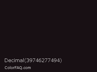 Decimal 39746277494 Color is a almost black rose color and the nearest color is Licorice #1a1110. Hex code #181014 and RGB value is rgb(24,16,20). In RGB color space, this color is composed of 9% red, 6% green, 8% blue, In CMYK color space, this color is composed of 0% cyan, 33% magenta, 17% yellow , 91% black , In HSL color space, this color has a hue angle of 330° , 20% saturation and 8% lightness.