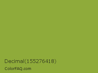Decimal 155276418 Color is a normal lime color and the nearest color is Sushi #87ab39. Hex code #8fab3a and RGB value is rgb(143,171,58). In RGB color space, this color is composed of 56% red, 67% green, 23% blue, In CMYK color space, this color is composed of 16% cyan, 0% magenta, 66% yellow , 33% black , In HSL color space, this color has a hue angle of 75° , 49% saturation and 45% lightness.