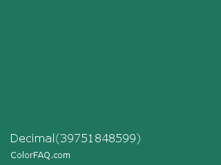 Decimal 39751848599 Color is a dark cyan color and the nearest color is Genoa #15736b. Hex code #207561 and RGB value is rgb(32,117,97). In RGB color space, this color is composed of 13% red, 46% green, 38% blue, In CMYK color space, this color is composed of 73% cyan, 0% magenta, 17% yellow , 54% black , In HSL color space, this color has a hue angle of 166° , 57% saturation and 29% lightness.