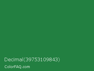 Decimal 39753109843 Color is a normal green color and the nearest color is Dark Spring Green #177245. Hex code #228041 and RGB value is rgb(34,128,65). In RGB color space, this color is composed of 13% red, 50% green, 25% blue, In CMYK color space, this color is composed of 73% cyan, 0% magenta, 49% yellow , 50% black , In HSL color space, this color has a hue angle of 140° , 58% saturation and 32% lightness.