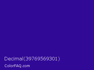Decimal 39769569301 Color is a normal indigo color and the nearest color is Blue Gem #2c0e8c. Hex code #310997 and RGB value is rgb(49,9,151). In RGB color space, this color is composed of 19% red, 4% green, 59% blue, In CMYK color space, this color is composed of 68% cyan, 94% magenta, 0% yellow , 41% black , In HSL color space, this color has a hue angle of 257° , 89% saturation and 31% lightness.