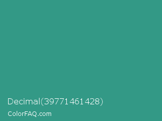 Decimal 39771461428 Color is a normal cyan color and the nearest color is Lochinvar #2c8c84. Hex code #339986 and RGB value is rgb(51,153,134). In RGB color space, this color is composed of 20% red, 60% green, 53% blue, In CMYK color space, this color is composed of 67% cyan, 0% magenta, 12% yellow , 40% black , In HSL color space, this color has a hue angle of 169° , 50% saturation and 40% lightness.