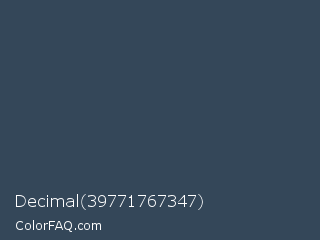 Decimal 39771767347 Color is a dark blue color and the nearest color is Pickled Bluewood #314459. Hex code #344759 and RGB value is rgb(52,71,89). In RGB color space, this color is composed of 20% red, 28% green, 35% blue, In CMYK color space, this color is composed of 42% cyan, 20% magenta, 0% yellow , 65% black , In HSL color space, this color has a hue angle of 209° , 26% saturation and 28% lightness.