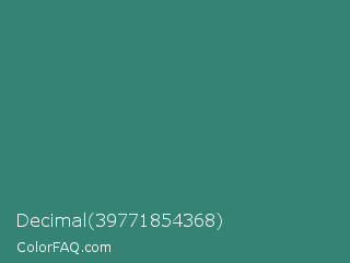 Decimal 39771854368 Color is a normal cyan color and the nearest color is Celadon Green #2f847c. Hex code #348374 and RGB value is rgb(52,131,116). In RGB color space, this color is composed of 20% red, 51% green, 45% blue, In CMYK color space, this color is composed of 60% cyan, 0% magenta, 11% yellow , 49% black , In HSL color space, this color has a hue angle of 169° , 43% saturation and 36% lightness.