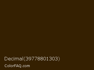 Decimal 39778801303 Color is a very dark orange color and the nearest color is Dark Ebony #3c2005. Hex code #352001 and RGB value is rgb(53,32,1). In RGB color space, this color is composed of 21% red, 13% green, 0% blue, In CMYK color space, this color is composed of 0% cyan, 40% magenta, 98% yellow , 79% black , In HSL color space, this color has a hue angle of 36° , 96% saturation and 11% lightness.