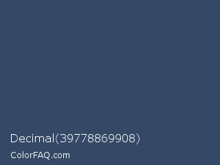 Decimal 39778869908 Color is a dark blue color and the nearest color is San Juan #304b6a. Hex code #354966 and RGB value is rgb(53,73,102). In RGB color space, this color is composed of 21% red, 29% green, 40% blue, In CMYK color space, this color is composed of 48% cyan, 28% magenta, 0% yellow , 60% black , In HSL color space, this color has a hue angle of 216° , 32% saturation and 30% lightness.