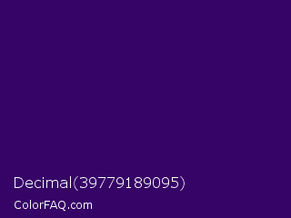 Decimal 39779189095 Color is a very dark violet color and the nearest color is Deep Violet #330066. Hex code #360467 and RGB value is rgb(54,4,103). In RGB color space, this color is composed of 21% red, 2% green, 40% blue, In CMYK color space, this color is composed of 48% cyan, 96% magenta, 0% yellow , 60% black , In HSL color space, this color has a hue angle of 270° , 93% saturation and 21% lightness.