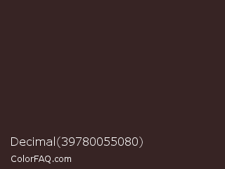 Decimal 39780055080 Color is a very dark red color and the nearest color is Treehouse #3b2820. Hex code #372424 and RGB value is rgb(55,36,36). In RGB color space, this color is composed of 22% red, 14% green, 14% blue, In CMYK color space, this color is composed of 0% cyan, 35% magenta, 35% yellow , 78% black , In HSL color space, this color has a hue angle of 0° , 21% saturation and 18% lightness.