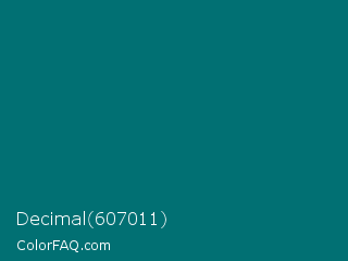 Decimal 607011 Color is a dark cyan color and the nearest color is Skobeloff #007474. Hex code #017073 and RGB value is rgb(1,112,115). In RGB color space, this color is composed of 0% red, 44% green, 45% blue, In CMYK color space, this color is composed of 99% cyan, 3% magenta, 0% yellow , 55% black , In HSL color space, this color has a hue angle of 182° , 98% saturation and 23% lightness.