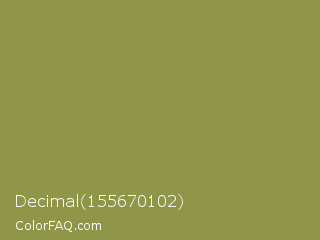 Decimal 155670102 Color is a normal yellow color and the nearest color is Sycamore #908d39. Hex code #909648 and RGB value is rgb(144,150,72). In RGB color space, this color is composed of 56% red, 59% green, 28% blue, In CMYK color space, this color is composed of 4% cyan, 0% magenta, 52% yellow , 41% black , In HSL color space, this color has a hue angle of 65° , 35% saturation and 44% lightness.