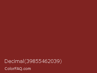 Decimal 39855462039 Color is a normal red color and the nearest color is Crown Of Thorns #771f1f. Hex code #802321 and RGB value is rgb(128,35,33). In RGB color space, this color is composed of 50% red, 14% green, 13% blue, In CMYK color space, this color is composed of 0% cyan, 73% magenta, 74% yellow , 50% black , In HSL color space, this color has a hue angle of 1° , 59% saturation and 32% lightness.