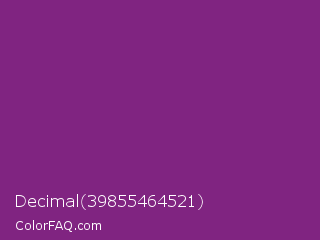 Decimal 39855464521 Color is a normal magenta color and the nearest color is Razzmic Berry Crayola #843179. Hex code #802481 and RGB value is rgb(128,36,129). In RGB color space, this color is composed of 50% red, 14% green, 51% blue, In CMYK color space, this color is composed of 1% cyan, 72% magenta, 0% yellow , 49% black , In HSL color space, this color has a hue angle of 299° , 56% saturation and 32% lightness.