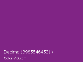 Decimal 39855464531 Color is a normal magenta color and the nearest color is Seance #731e8f. Hex code #802485 and RGB value is rgb(128,36,133). In RGB color space, this color is composed of 50% red, 14% green, 52% blue, In CMYK color space, this color is composed of 4% cyan, 73% magenta, 0% yellow , 48% black , In HSL color space, this color has a hue angle of 297° , 57% saturation and 33% lightness.