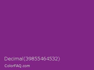 Decimal 39855464532 Color is a normal magenta color and the nearest color is Seance #731e8f. Hex code #802486 and RGB value is rgb(128,36,134). In RGB color space, this color is composed of 50% red, 14% green, 53% blue, In CMYK color space, this color is composed of 4% cyan, 73% magenta, 0% yellow , 47% black , In HSL color space, this color has a hue angle of 296° , 58% saturation and 33% lightness.