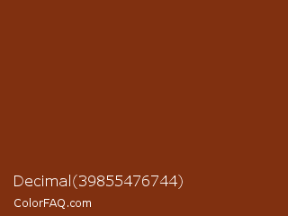Decimal 39855476744 Color is a dark orange color and the nearest color is Pueblo #7d2c14. Hex code #803010 and RGB value is rgb(128,48,16). In RGB color space, this color is composed of 50% red, 19% green, 6% blue, In CMYK color space, this color is composed of 0% cyan, 63% magenta, 88% yellow , 50% black , In HSL color space, this color has a hue angle of 17° , 78% saturation and 28% lightness.