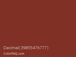 Decimal 39855476777 Color is a normal red color and the nearest color is Red Robin #80341f. Hex code #803025 and RGB value is rgb(128,48,37). In RGB color space, this color is composed of 50% red, 19% green, 15% blue, In CMYK color space, this color is composed of 0% cyan, 63% magenta, 71% yellow , 50% black , In HSL color space, this color has a hue angle of 7° , 55% saturation and 32% lightness.