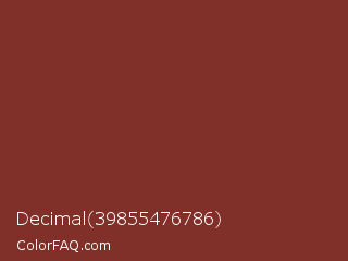 Decimal 39855476786 Color is a normal red color and the nearest color is Red Robin #80341f. Hex code #803028 and RGB value is rgb(128,48,40). In RGB color space, this color is composed of 50% red, 19% green, 16% blue, In CMYK color space, this color is composed of 0% cyan, 63% magenta, 69% yellow , 50% black , In HSL color space, this color has a hue angle of 5° , 52% saturation and 33% lightness.