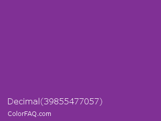 Decimal 39855477057 Color is a normal purple color and the nearest color is Vivid Violet #803790. Hex code #803095 and RGB value is rgb(128,48,149). In RGB color space, this color is composed of 50% red, 19% green, 58% blue, In CMYK color space, this color is composed of 14% cyan, 68% magenta, 0% yellow , 42% black , In HSL color space, this color has a hue angle of 288° , 51% saturation and 39% lightness.
