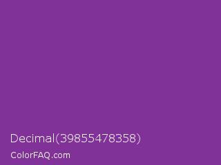 Decimal 39855478358 Color is a normal purple color and the nearest color is Vivid Violet #803790. Hex code #803298 and RGB value is rgb(128,50,152). In RGB color space, this color is composed of 50% red, 20% green, 60% blue, In CMYK color space, this color is composed of 16% cyan, 67% magenta, 0% yellow , 40% black , In HSL color space, this color has a hue angle of 286° , 50% saturation and 40% lightness.