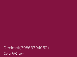 Decimal 39863794052 Color is a dark rose color and the nearest color is Rose Bud Cherry #800b47. Hex code #831240 and RGB value is rgb(131,18,64). In RGB color space, this color is composed of 51% red, 7% green, 25% blue, In CMYK color space, this color is composed of 0% cyan, 86% magenta, 51% yellow , 49% black , In HSL color space, this color has a hue angle of 336° , 76% saturation and 29% lightness.