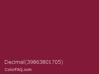 Decimal 39863801705 Color is a normal rose color and the nearest color is Claret #7f1734. Hex code #831939 and RGB value is rgb(131,25,57). In RGB color space, this color is composed of 51% red, 10% green, 22% blue, In CMYK color space, this color is composed of 0% cyan, 81% magenta, 56% yellow , 49% black , In HSL color space, this color has a hue angle of 342° , 68% saturation and 31% lightness.