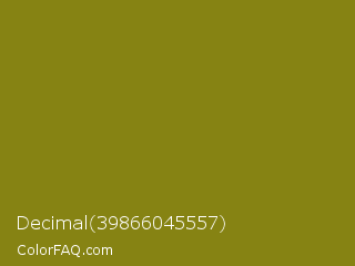 Decimal 39866045557 Color is a dark yellow color and the nearest color is Trendy Green #7c881a. Hex code #868313 and RGB value is rgb(134,131,19). In RGB color space, this color is composed of 53% red, 51% green, 7% blue, In CMYK color space, this color is composed of 0% cyan, 2% magenta, 86% yellow , 47% black , In HSL color space, this color has a hue angle of 58° , 75% saturation and 30% lightness.