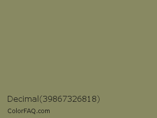 Decimal 39867326818 Color is a normal yellow color and the nearest color is Avocado Pulp #888d65. Hex code #888962 and RGB value is rgb(136,137,98). In RGB color space, this color is composed of 53% red, 54% green, 38% blue, In CMYK color space, this color is composed of 1% cyan, 0% magenta, 28% yellow , 46% black , In HSL color space, this color has a hue angle of 62° , 17% saturation and 46% lightness.