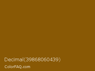 Decimal 39868060439 Color is a dark orange color and the nearest color is Rusty Nail #86560a. Hex code #895905 and RGB value is rgb(137,89,5). In RGB color space, this color is composed of 54% red, 35% green, 2% blue, In CMYK color space, this color is composed of 0% cyan, 35% magenta, 96% yellow , 46% black , In HSL color space, this color has a hue angle of 38° , 93% saturation and 28% lightness.