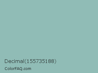 Decimal 155735188 Color is a light cyan color and the nearest color is Shadow Green #9ac2b8. Hex code #90bcb6 and RGB value is rgb(144,188,182). In RGB color space, this color is composed of 56% red, 74% green, 71% blue, In CMYK color space, this color is composed of 23% cyan, 0% magenta, 3% yellow , 26% black , In HSL color space, this color has a hue angle of 172° , 25% saturation and 65% lightness.
